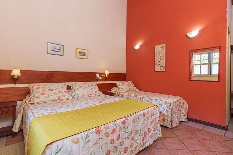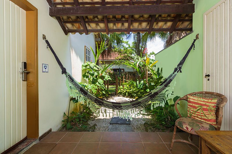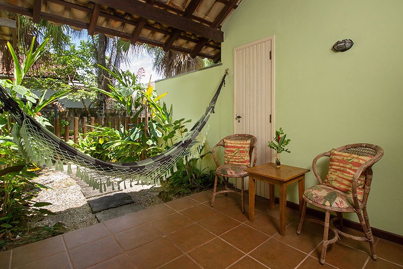 Apartamento amplo e arejado com 34m², sendo 8m² de varanda com jardim privativo, equipada com rede, mesinha de centro e duas cadeiras. Este apartamento possui dois ambientes, uma sala com sofá bicama e o quarto com cama de casal.
