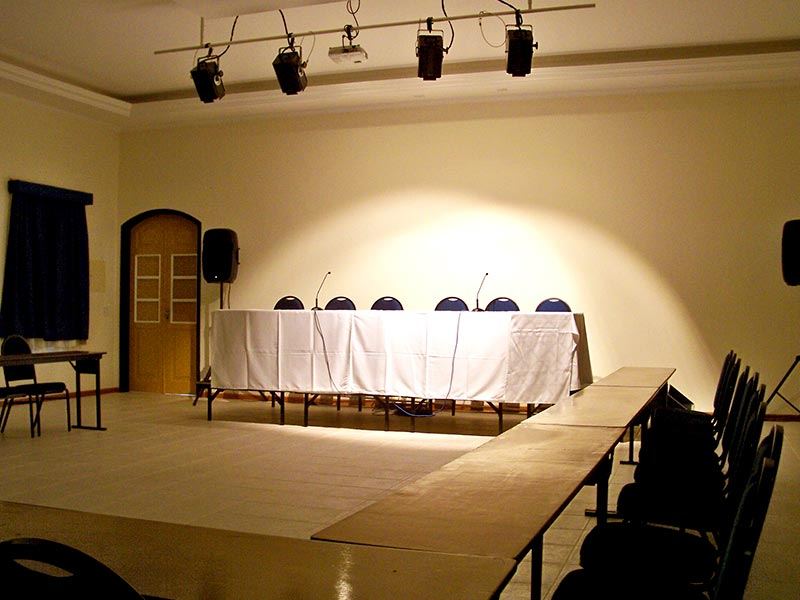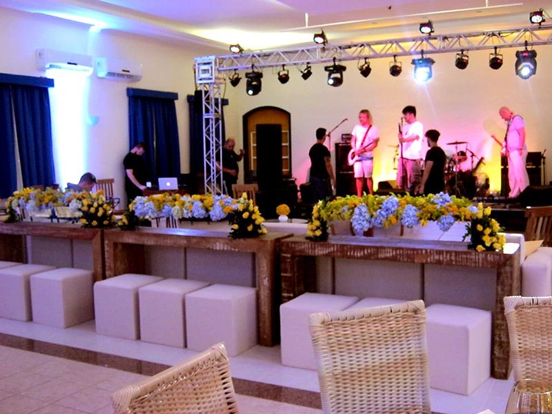 Equipamentos: 180 cadeiras estofadas, 4 mesas (80x150), 12 mesas (40x150), 6 palcos modulares de 1,00x1,20m/cada.